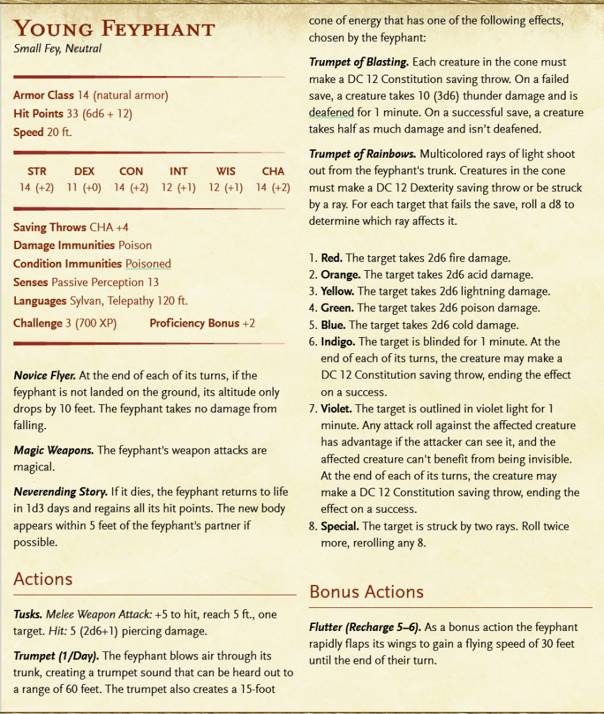 - This twist on the event provides the party with a friendly companion – the adorable feyphant (a twist on the hollyphant). This is completely optional but can be particularly fun if you have a small party in need of combat help or players who you know will enjoy a pet (or perhaps were very distraught when they lost Juniper). If you like the idea of a pet but not any additional help in combat, just remove all of the actions from its stat block