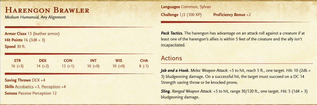- Don’t be afraid to let a fight break out here if the party is combat starved. However, it is a bit boring to fight six of the same statblock. As a result I mixed up the group into 2 harengon brigands, 2 harengon snipers, and Jebbek (a harengon brawler – a new stat block, see below). I would appropriately set-up the snipers in the back as they are more focused on ranged attacks, while Jebbek and the brigands man the front-lines