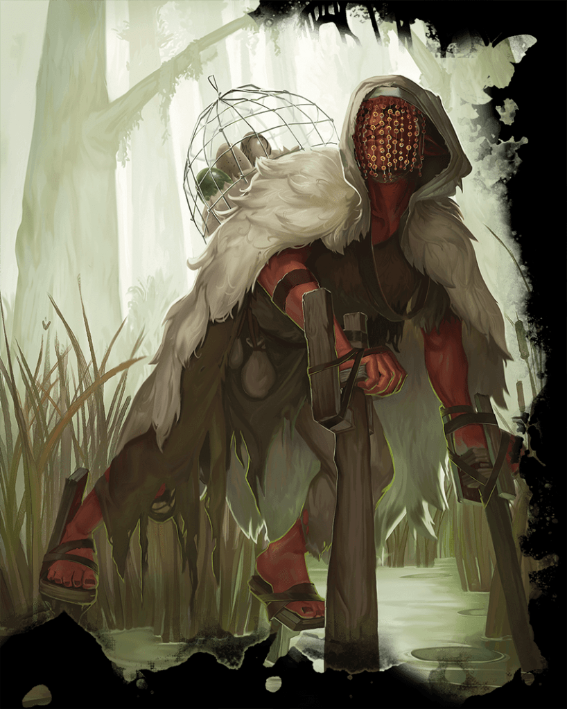 Through the mist you see six humanoid creatures dressed in patchwork rags and furs. Strapped on their backs are wire cages filled with straw and eggs of various sizes and colors. Instead of trudging through the swamp as you have, they have propped themselves onto stilts. As you watch you see they have surrounded a well of hewn stone and appear to be filling their waterskins.