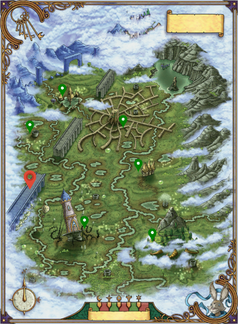 - Rather than just describe landmarks, I placed markers on the map to demonstrate the locations the players could go (and removed location names until they learned them) as well as where they currently were (see image below)
