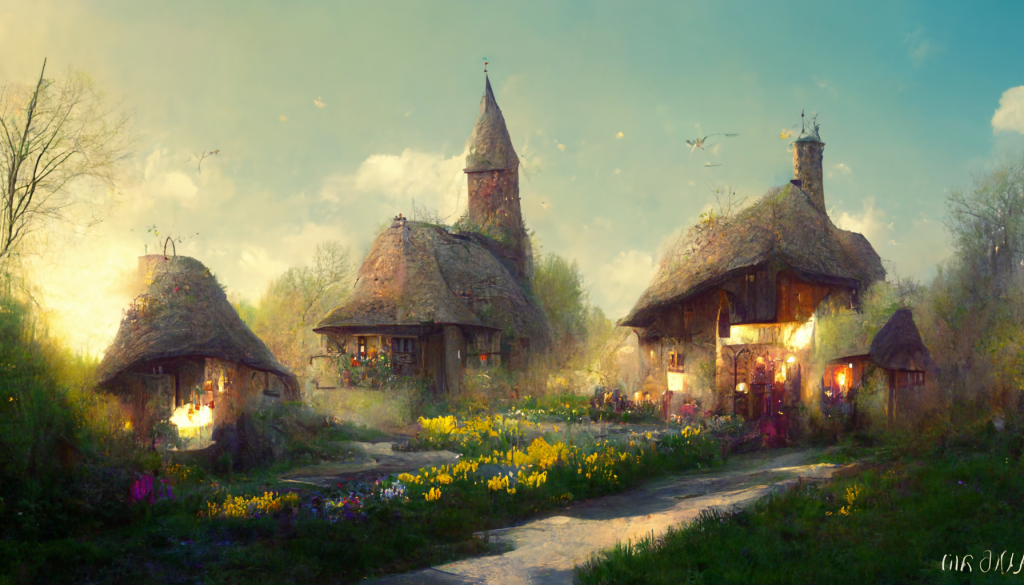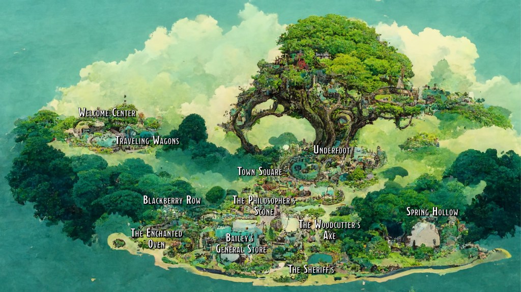As you continue past the welcome center, the village comes closer into focus. The buildings are mostly thatched cottages of varying sizes, some with turfed grass roofs, and others larger. The land is dotted with trees, brimming with plump fruit, though one in particular sticks out in the center of town rising above all of the rest – its canopy stretching over the village and providing a pleasant and cool shade even all the way to the edge of town. As you take it all in, a group of children rush by chasing sheep and the aroma of fresh baked goods fills the air.