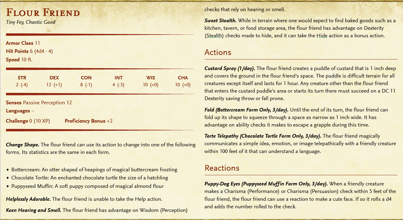 Once per day while holding this whisk, you can speak its command word as an action to summon a flour friend in an unoccupied space you choose within 5 feet of you. The flour friend is a magically infused baked dessert that is friendly to you and your companions for the duration. When summoned it takes the shape of your choice as per its change shape ability.