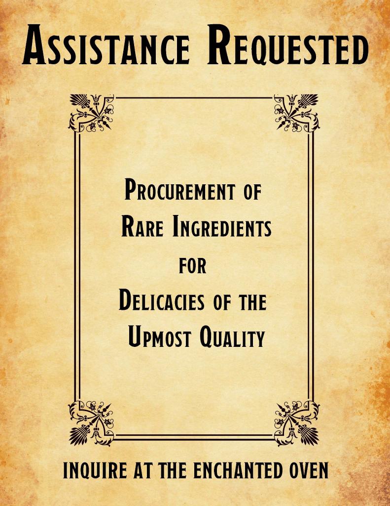 If the players inquire about the poster, Ilse will share that the Summer Queen holds a contest to add a new personal baker to her repertoire every 5 years. For some reason no one has come to act as the judge, so Titania’s loyal knight, Ser Del Goldenpetal, who was already in town will decide the contest winner. There will be a taste testing and it’s imperative that Ilse is able to produce the best possible dish for the competition.