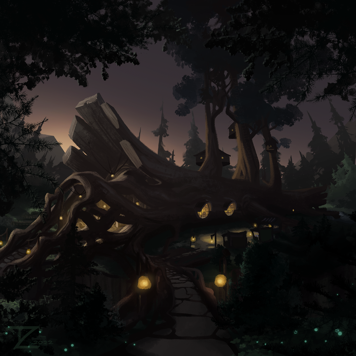 The forest is at its darkest here. Up ahead, a colossal dead oak lies on its side. Three living trees grow naturally out of its fallen remains. Their shapes resemble towers, with candlelit windows twinkling in the gloom and wooden balconies encircling gnarled branches. On one side of the fallen tree, firelight spills from a pair of quaint storefront windows, illuminating a clearing filled with merchant stalls. A gnarled bridge formed by tangled tree roots spans a rocky, dried-up riverbed leading in that direction. A similar bridge to the west leads directly into the oak itself and seems to be guarded by two small constructs in the shape of soldiers.