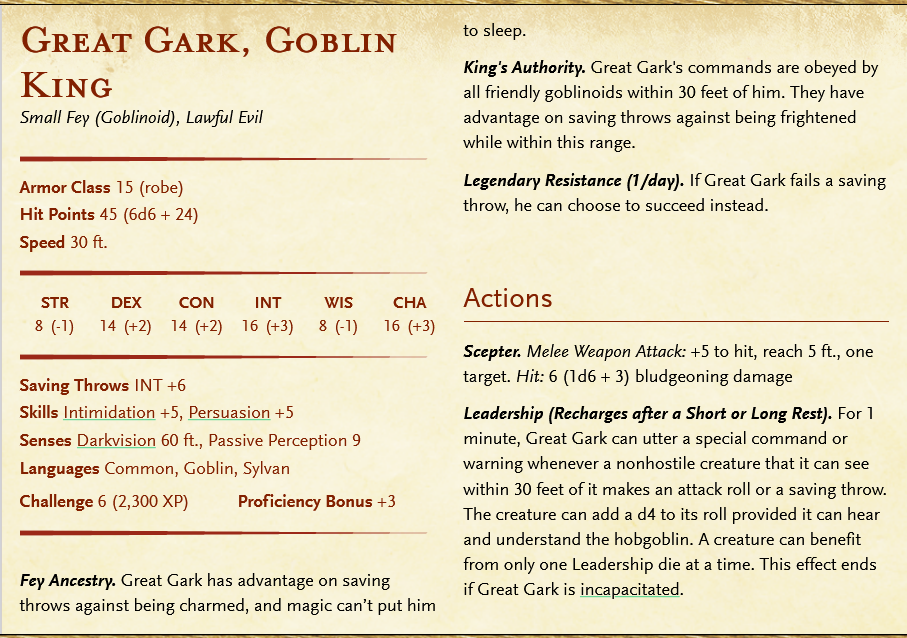 - When the players arrive, Gark is flanked by his two most trusted advisors – General Brix (a goblin overseer) and the Grand Wiz Redtooth (a hobgoblin devastator – Volo’s Guide to Monsters). They are clearly in the middle of an audience with three members of the League of Malevolence – Kelek, Zarak, and Warduke. Kelek is doing all of the talking while the other two do their best to look intimidating.