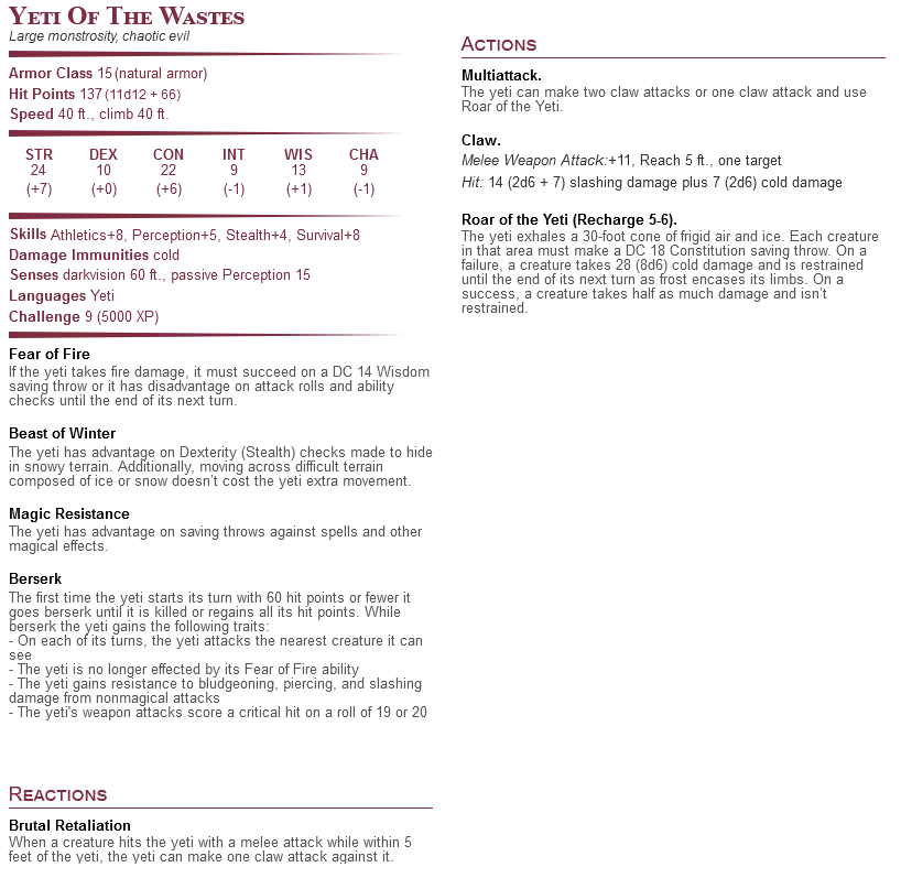 • A character who makes a successful DC 18 Perception check gets whiff of the scent of wet fur on the air, while a 25 or higher will see a hint of the Yeti of the Wastes (see below) body hidden beneath the snow on a ridge south of the cave.