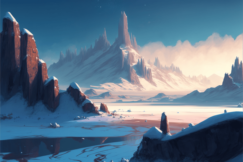 The Frozen Wastes are an open expanse of snow and ice, with little in the way of plant life, though a ferocious yeti stalks the land. It will take the party about three days to reach The Shimmerstorm Mountains so I’ve broken up this section accordingly.