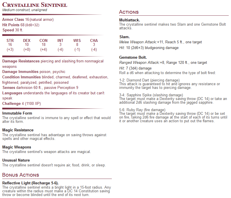 Once through the obstacle, the players will be be brought into a path continuing deeper into the mines. I used this map by FairyTale Maps to represent it. There are 3 crystalline sentinels and 5 crystalline lookouts (see below) that will attack any intruders, but if the players successfully did not break any of the icicles, the party will be not be spotted by the creatures when they first arrive. These golems once were tasked with overseeing work done here in the mines, but this area has long been stripped and abandoned for greener pastures.