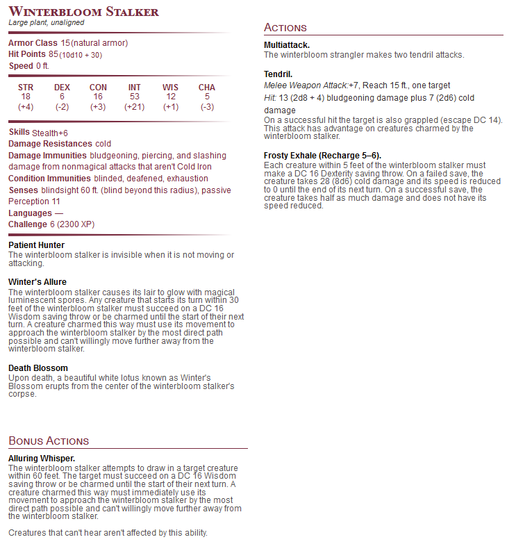 While dangerous, once the winterbloom stalker dies, it will bloom – revealing a winter’s blossom, a beautiful white lotus, and the flower potentially requested by Rian Coldmoon of the Winter Court. Otherwise a winter’s blossom is valued at 500 gp.Ā