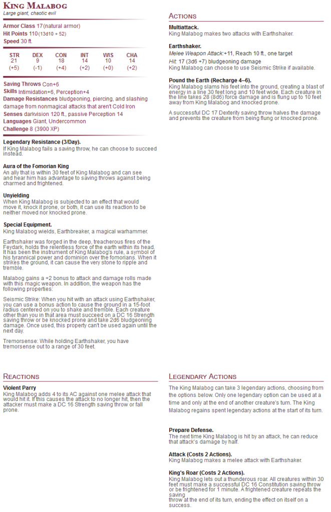 When King Malabog is defeated the party will be able to loot his weapon earthshaker (see below) as well as his golden crown which is worth 1,000 gp. The characters should also level up the party to Level 9!