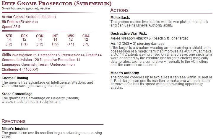 The creatures are three deep gnomes (Basic Rules) and one deep gnome prospector (see below). Like the elementals in area 2, their long imprisonment in the Feydark has caused them to take a darker turn, and they will likely immediately attack any intruders. They will be very surprised by outsiders though, and a clever party may be able to convince them (as well as other gnomes in the Feydark) to stand down with a good story.