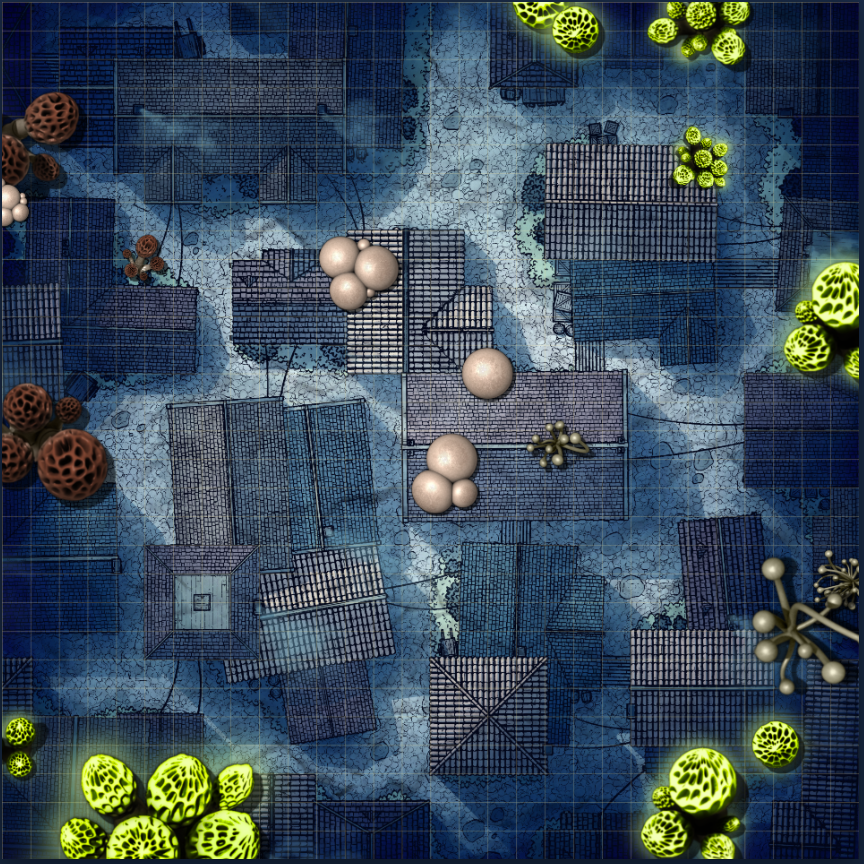 After a bit of exploration, put the party on a map to search the town. I used the Winding Alleys (night variant) map by Neutral Party and then dropped in some mushrooms as you can see below. I placed the party to the south with the goal of reaching the top.
