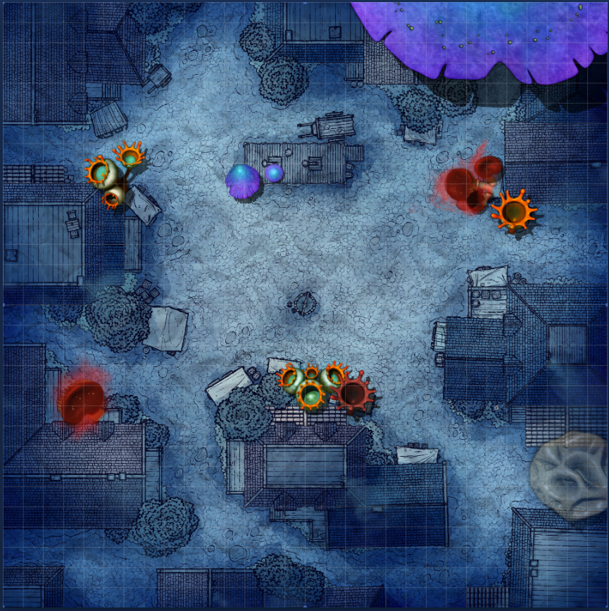 Once they arrive I used the Hangman’s Courtyard map (night variant) by Neutral Party to represent the area and also added mushrooms (like below). In the center of the map I placed the party’s target – The Great Moldenroot (see below). Once it is killed the players can retrieve it’s roots for Linden and return back.