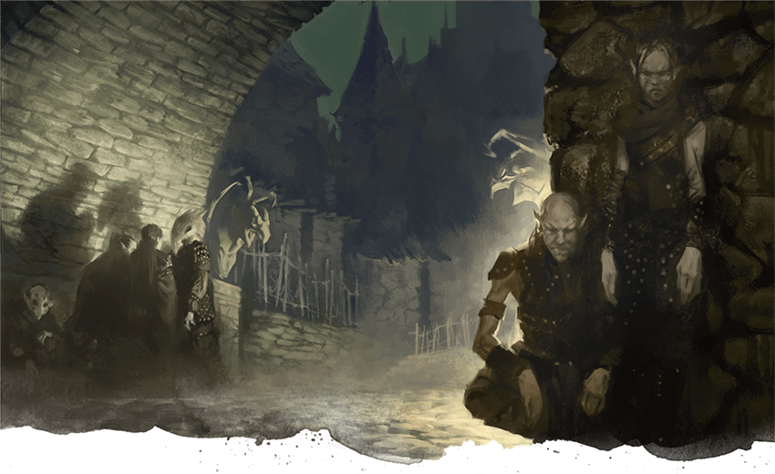 “Who goes there?” A voice calls out as a group of figures dressed in black leather approach. The speaker, a woman, grips an iron-wrought lantern filled with glowing moss. The others hold their cloaks tight to keep warm from the chill.
