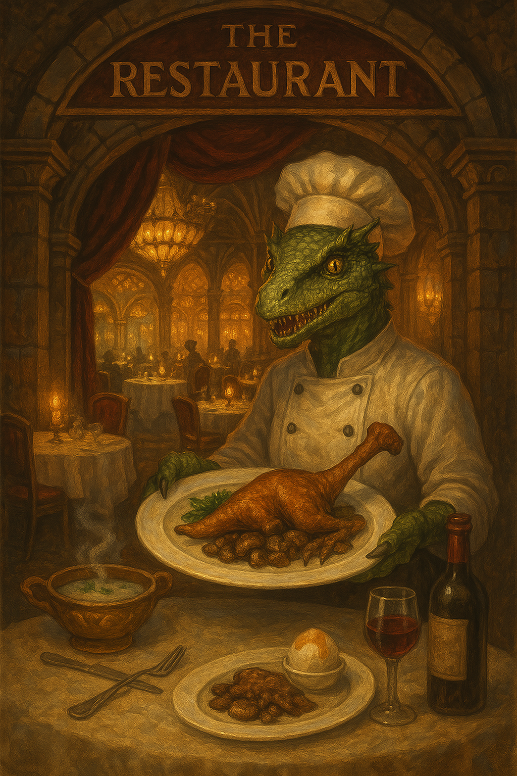 Tender slow-roasted velociraptor meat from the depths of the Chultan jungle served with a side of pan cooked mushrooms picked from the Underdark