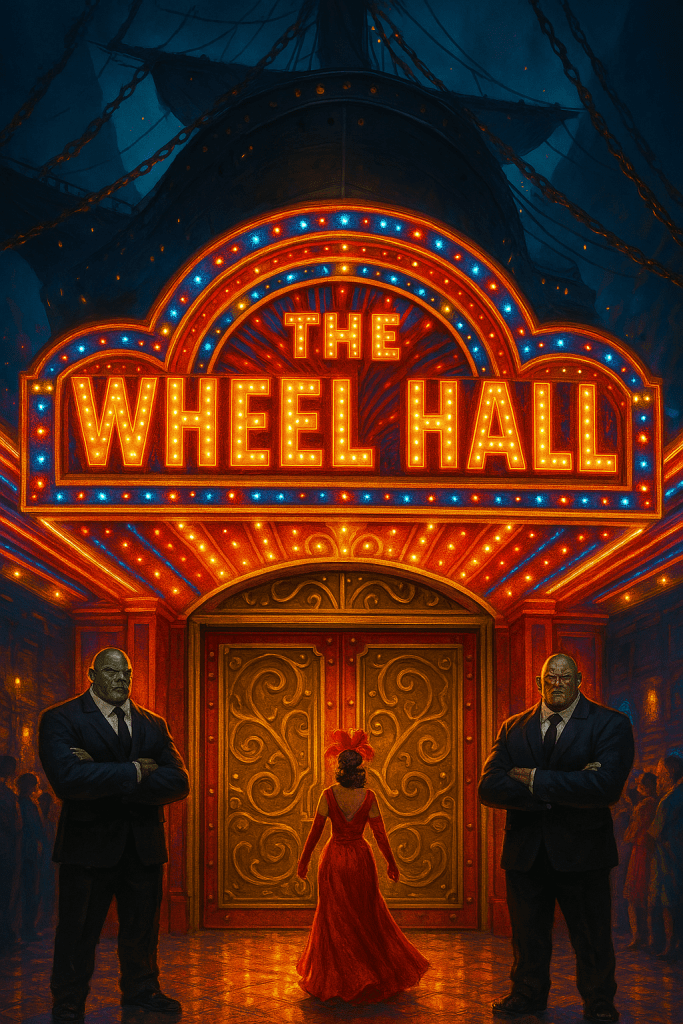 An imposing set of ironwork double doors are guarded by two burly half-orcs clad in black suits. Their eyes scrutinize each patron, occasionally throwing someone out of line. Above the doors, a sign reads “The Wheel Hall”, the letters magically glowing in the dim light of Skullport.