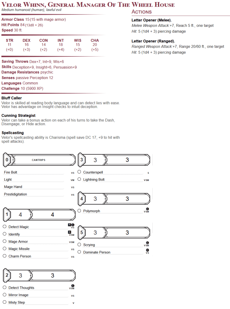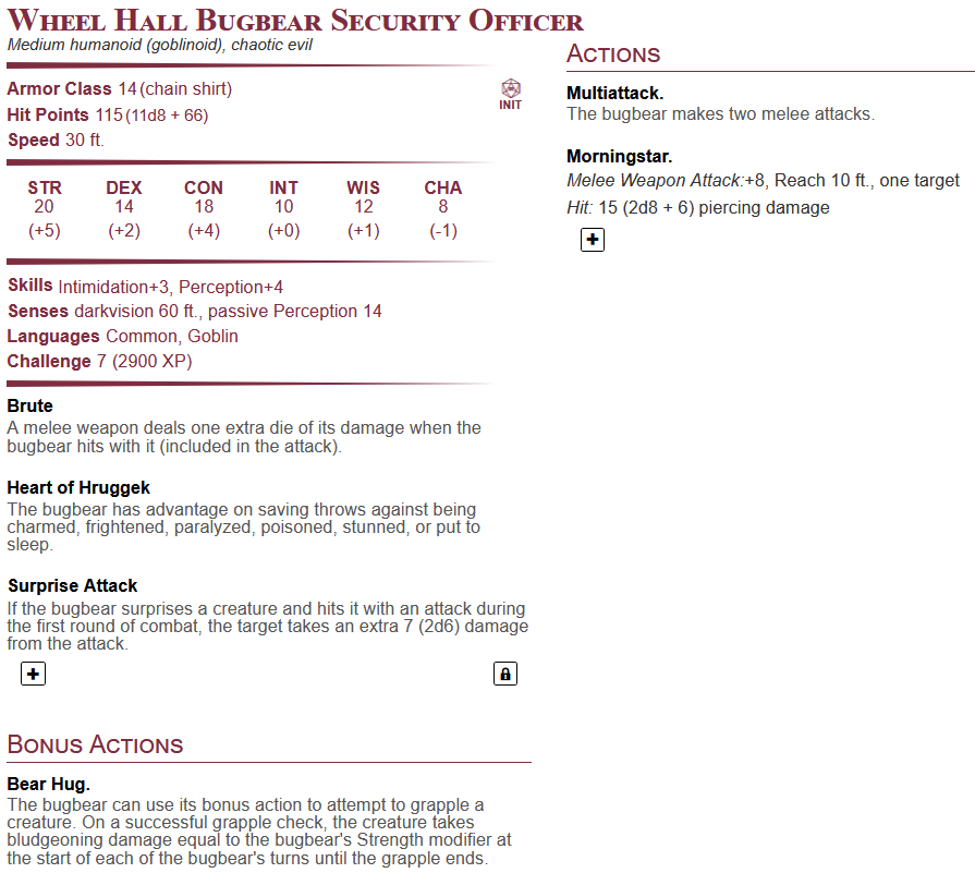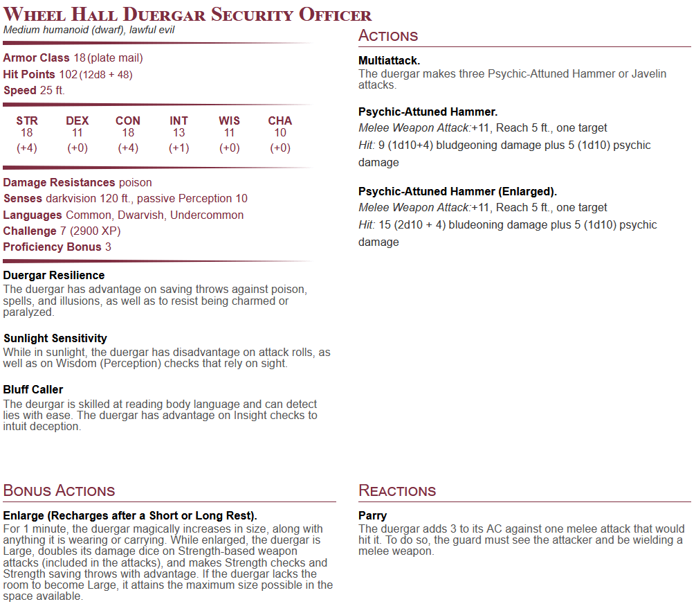 • As a note, any guards in the casino are wheel hall security officers (see “Stat Blocks”- and feel free to mix up using the different duergar, half-orc, and bugbear variants).