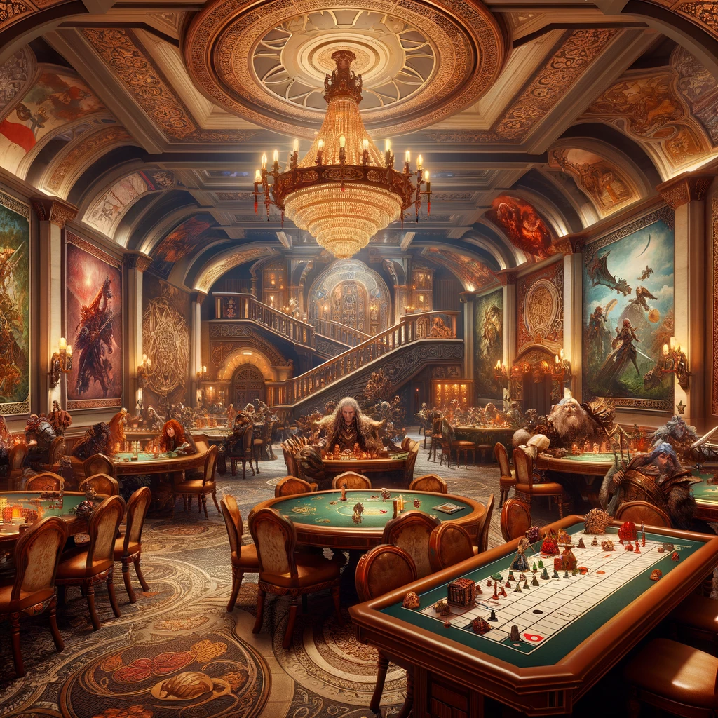 As you step inside, you’re greeted by the opulent sight of golden tapestries and crystal chandeliers. The room buzzes with the energy of a hundred conversations, the roll of dice, and the clinking of coins. Gamblers of all sorts crowd the tables, while other drink away their woes at a circular bar, “The Gilded Eye”, in the middle of the room.