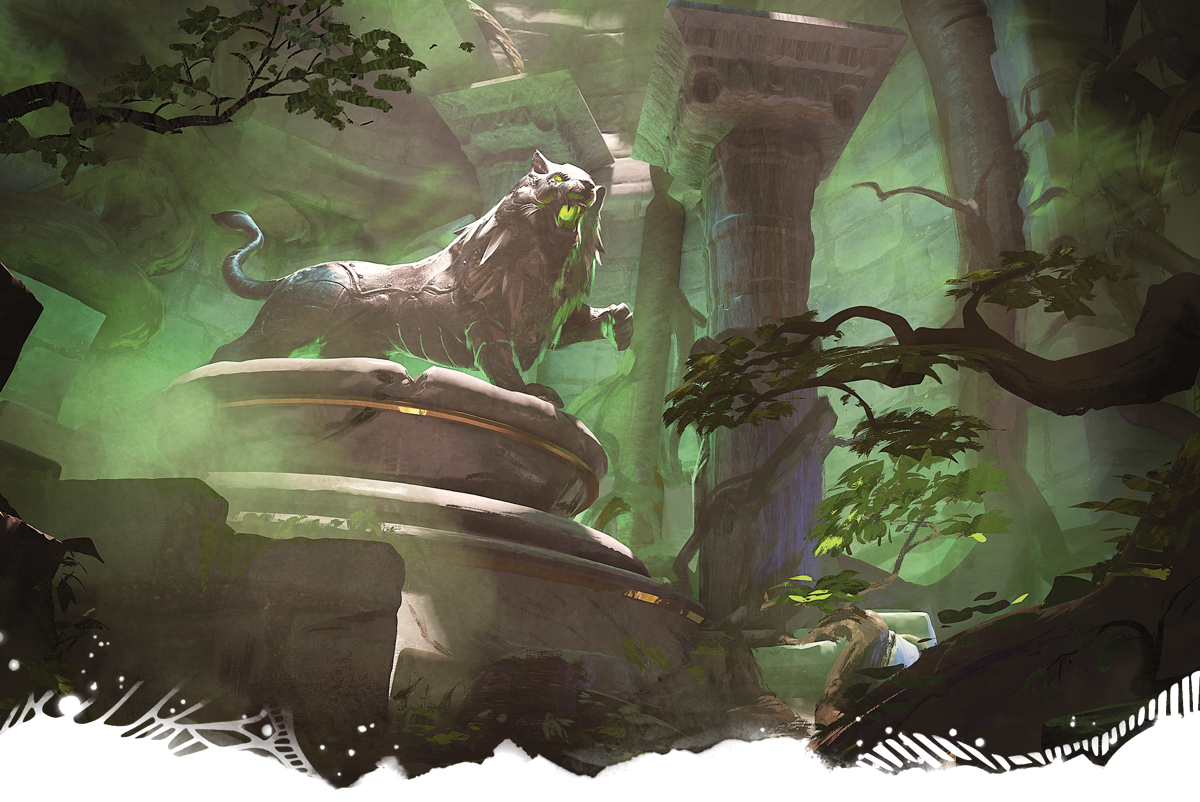 Tucked into the garden is a massive rose of vibrant pinks and reds that almost seems to glow in the sunlight. Two hulking plant-like creatures dressed in armor stand at attention in front of it.